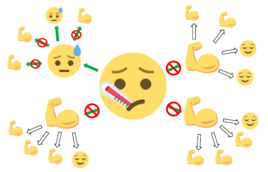 Herd immunity happens when there are enough people within a society who are immune to an infectious disease so that it can no longer spread efficiently. 100% of people don’t need to have been infected/immune for herd immunity to happen. Depending on how contagious a pathogen is, once a population hits 60-80% immunity, herd immunity will begin to protect all members of society, and will decrease disease spread. The more contagious a disease is, the more people must be immune to it for herd immunity to start to protect even those who were never infected themselves. Here’s my diagram of this: